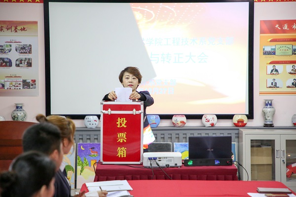 随后,党支部对预备党员刘沫同志的转正申请进行大会讨论。刘沫同志就成为预备党员一年以来所取得的成绩和提高进行汇报,工程技术系党支部书记刘姜青同志、工程技术系教学副主任高源同志对其发表转正意见,经不记名投票,一致同意刘沫同志按期转为中共正式党员。