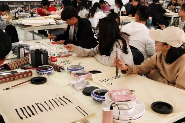 在书法课的课堂上,同学们全神贯注,仔细聆听老师的教诲并认真观察老师的书写手法。在老师的潜移默化下,同学们对书法兴趣颇丰,认真练习每一幅作品。