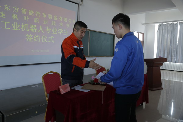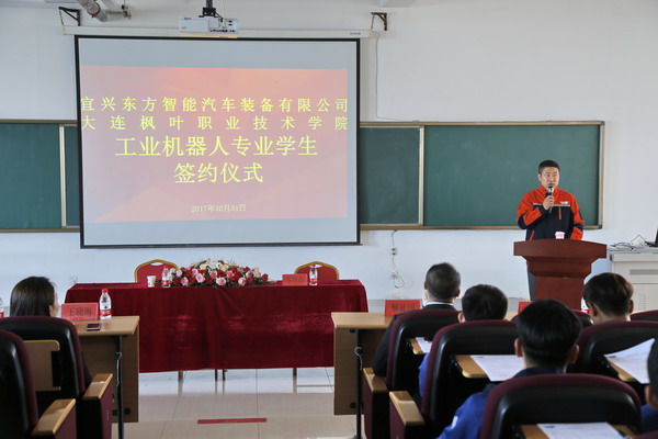 为进一步深化职业教育教学改革,全面推进产教深度融合,更好的为社会为企业培养高素质、高技能的应用型人才。更好地为区域产业发展服务。在校企双方共同努力下,江苏宜兴东方智能汽车装备有限公司与大连枫叶职业技术学院工业机器人专业签约仪式于2017年10月31日在多媒体教室隆重举行。出席本次签约仪式的嘉宾和领导有江苏宜兴东方智能汽车装备有限公司、宜兴市东方智能职业培训学校总经理张全臣,大连枫叶职业技术学院副院长解建国、培训部主任周丹、工程技术系主任王晓琳、工程技术系教学副主任高源、工业机器人专业辅导员张玲玲、专业教师杨杉。