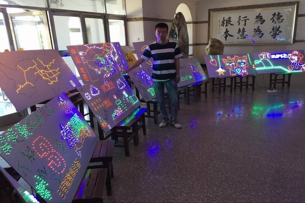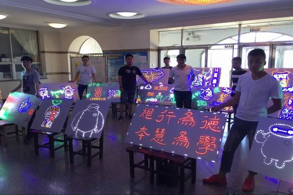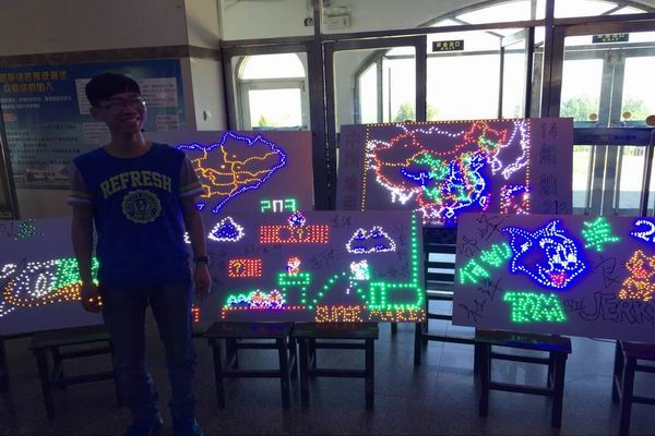 会展由于彬老师老师指导,经历了三个月的奋斗,利用10次电工课的时间,14级船舶专业学生终于在顶岗实习之前完成了这次专业作品展。从最开始的电路学习,接线学习,到对每一个 LED灯的效验,质量测量,都是一份辛苦活,一个展板可能要200-400个 LED灯,每个小灯泡都要保证可以正常使用,然后对不同颜色,不同电阻,不同闪光状态(例如:常亮,跑马灯等)的灯泡进行焊接,排线,一直到今天,每个作品能闪亮的展现出来都是一点一点的知识和经验堆积而成,每个展板的背后也都是学生一点点努力和汗水串起来的。