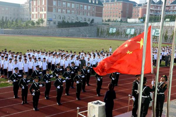 主持人首先宣布升旗仪式正式开始。旗手擎旗与两名护旗手整齐有力的正步让人感觉到军人的力量与威势;国歌奏响,鲜红的国旗在风中展开,全体师生行注目礼,目视国旗在国歌声中冉冉升起。国歌结束时,国旗也升至杆顶,全场礼毕。接着由新生代表发言,他的发言充满了对新学期的期望和憧憬,表达了对学校、老师的谢意,同时在发言中他代表全体同学郑重承诺:一定会珍惜学习中的分分秒秒,用最大的热情和努力迎接新学期新生活。最后学生处处长高成林对本次新学期工作进行部署并对军训期间相关事情做以要求,军训是新生的第一堂课,也将是新生难忘和骄傲的一段经历,在军训中良好的表现不仅可以给教官、老师、同学留下一个好印象,而且还可以锻炼自己的意志和毅力。同时教官对当天的军训任务进行布置 ,全体参训同学情绪高昂,同学们充满斗志的迎接军训的开始。