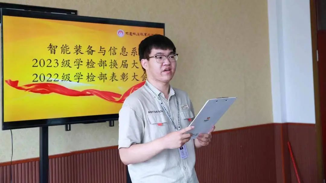 智能装备与信息系党支部书记高源对2022级学检部学生干部进行表彰。