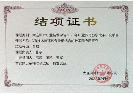张宇,大连枫叶职业技术学院信息工程系数字艺术设计专业群专业长,副教授。带领专业团队获批大连市特色高水平专业群建设立项、辽宁省兴辽卓越专业群建设立项、获得辽宁省职业教育现代学徒制示范专业荣誉。主持一项中国民办教育协会课题(在研)、两项辽宁省民办教育协会课题、两项大连市级课题(在研)、两项院级课题;发表国家级论文4篇;获三次省教育教学信息化大赛一等奖,一次二等奖,一次三等奖;获全国新职业技术技能大赛辽宁选拔赛——虚拟现实技术项目二等奖;一篇论文获得“民办教育教学优秀论文”三等奖;市级教学竞赛三等奖;获得辽宁省2023年度职业教育专业带头人,辽宁省2022年度职业教育骨干教师;院级教学能力大赛一等奖,等数十项其他奖项。