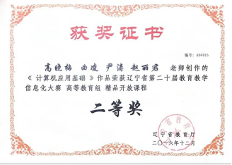 主持精品课《计算机应用基础》获辽宁省教育厅“辽宁省高等教育精品开放课程”二等奖。