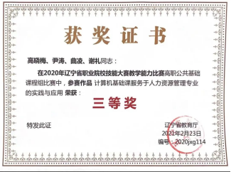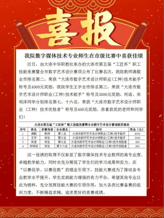 第五届“工匠杯数字艺术设计大赛”二等奖并获得大连数字艺术设计师职业技术能手称号。